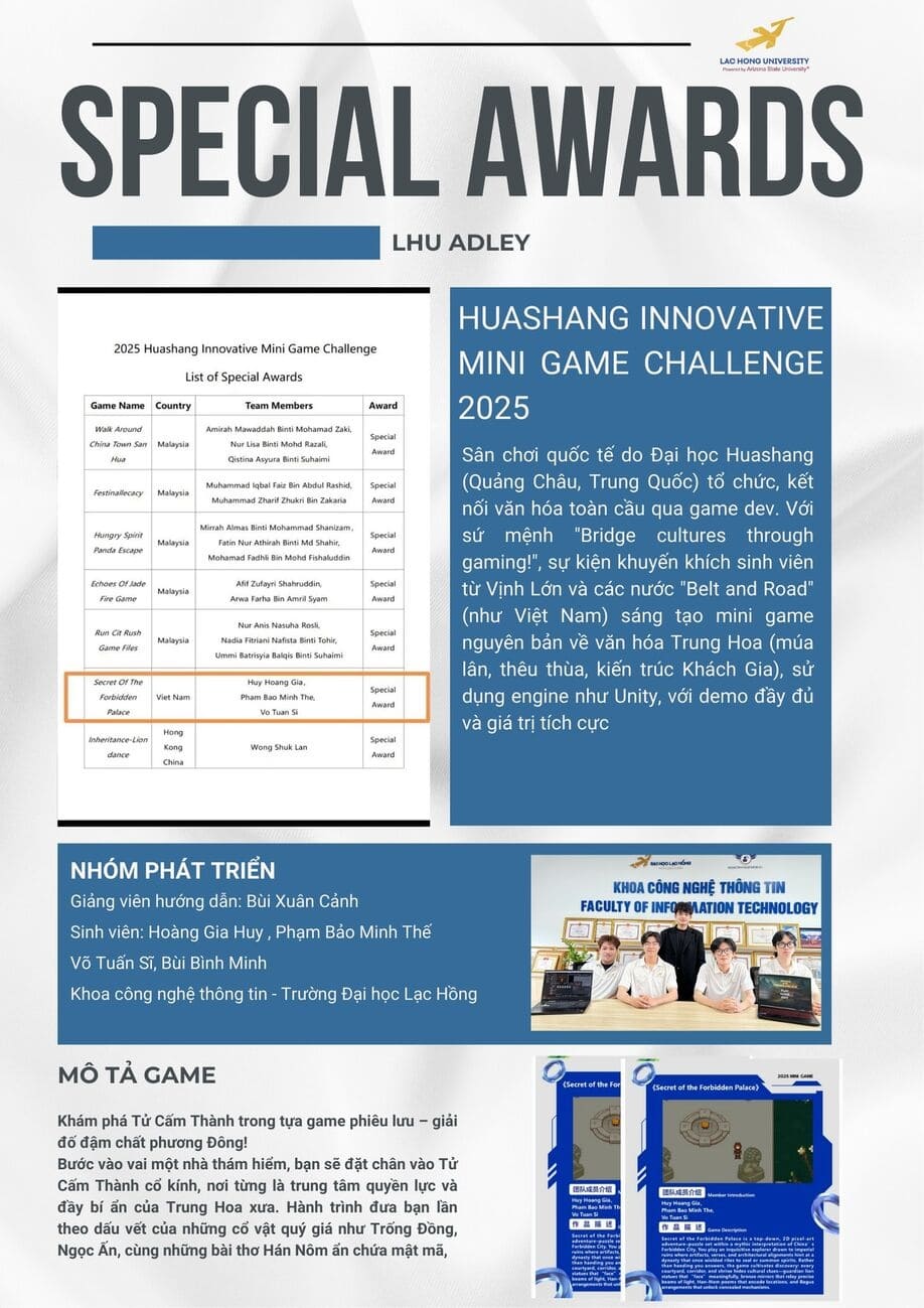 Ngày 25/09/2025, Trường Đại học Lạc Hồng (LHU) tiếp tục khẳng định vị thế trong khu vực và quốc tế khi đội thi LHU Adley đến từ Khoa Công nghệ Thông tin đã xuất sắc giành Giải Đặc Biệt (Special Award) tại Cuộc thi Huashang Innovative Mini Game Challenge 2025, được tổ chức bởi Đại học Huashang, Quảng Châu – Trung Quốc.
