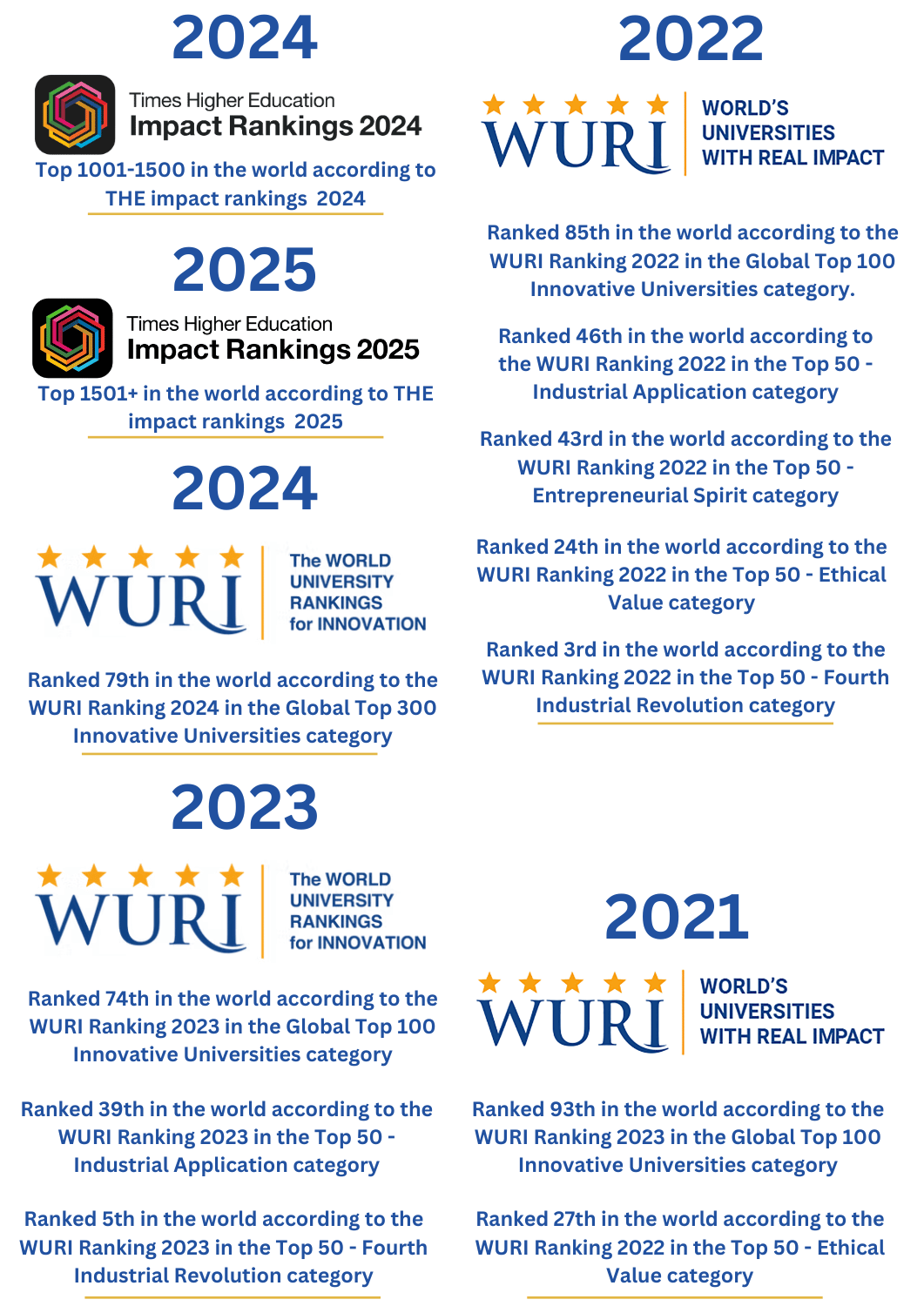 WURI is a global benchmark assessing universities’ innovation capacity. Established in 2020, WURI has expanded its evaluation scope across multiple categories, focusing on innovation and societal contributions. Unlike traditional rankings, WURI emphasizes practical contributions to society, including creativity, industrial application, entrepreneurship, and ethical values that drive research and education.