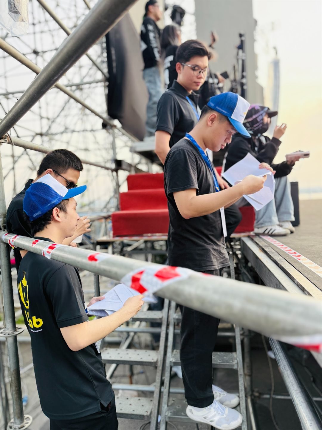 In the days leading up to the Tran Bien Countdown, the backstage area has been in a state of constant activity. Sound checks, lighting demos, signal testing, and various technological devices are operating around the clock. Amidst this bustling environment, students and alumni from Lac Hong University (LHU) are directly managing several key technical and media components, contributing to the creation of a modern and professional community event.