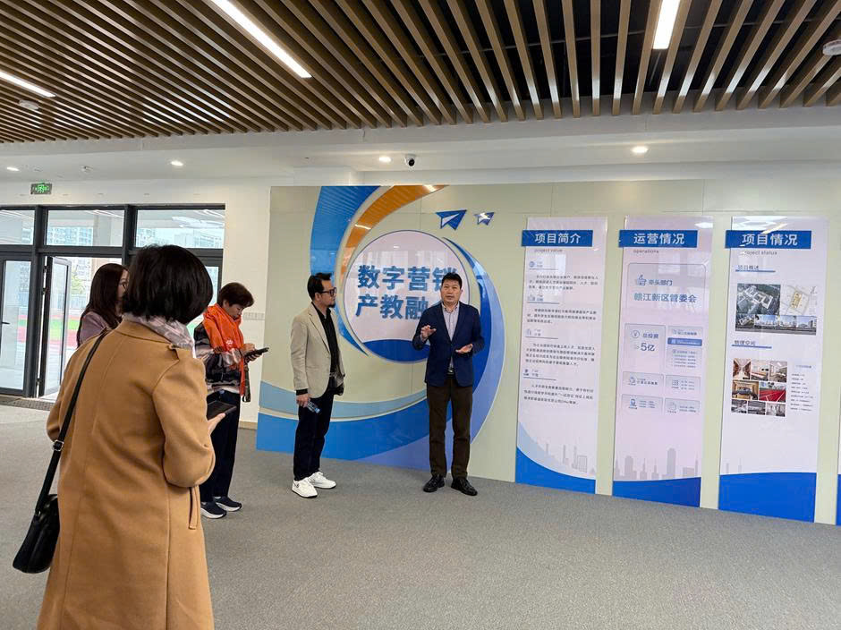 The LHU delegation listens to a representative present an overview of the project and the operational model of the Integrated Digital Marketing Training Base