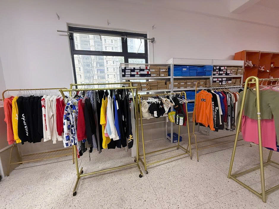 The storage and display area for actual merchandise (clothing, footwear) used directly in the students' live commerce projects